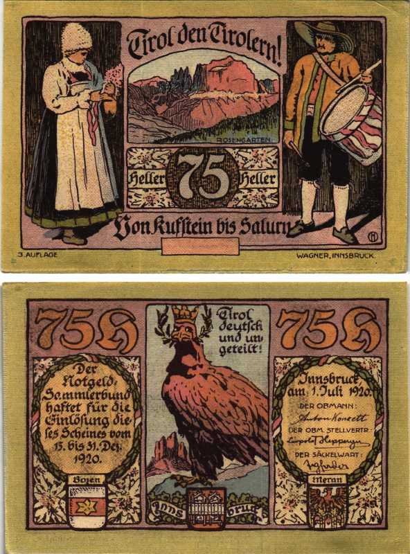 ИНСБРУК 75 ГЕЛЛЕРОВ 1920 НОТГЕЛЬД, 15-31 ДЕКАБРЯ 1920, ЗЕМЛЯ ТИРОЛЬ бумага 7205-33-1-2