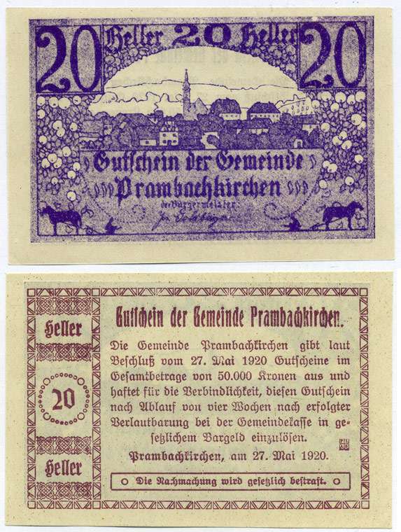 Австрия, Прамбахкирхен 20 геллеров 1920 27 мая 1920, нотгельд, ярмарочная коммуна в земле Верхняя Австрия бумага UNC (пресс) 7221-17-1-2