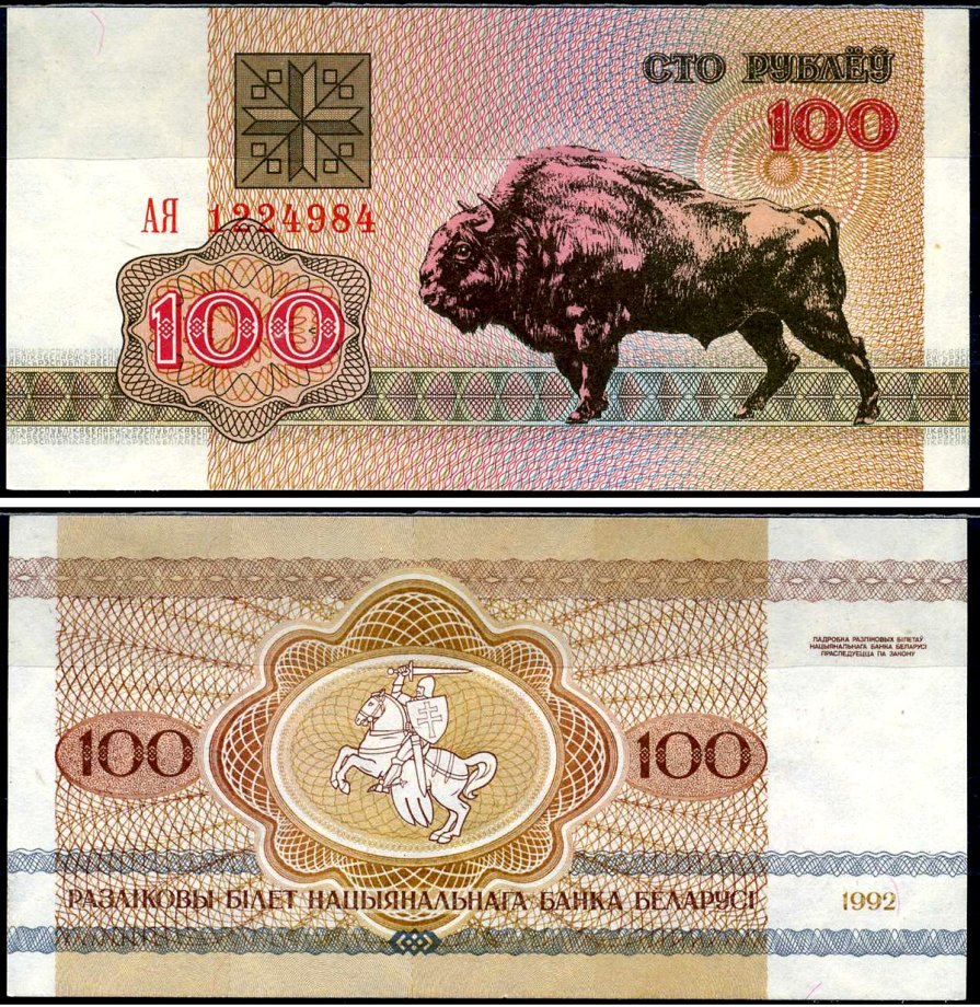 Беларусь 100 рублей 1992 Pick 8 (2) бумага aUNC 7221-43-1-1