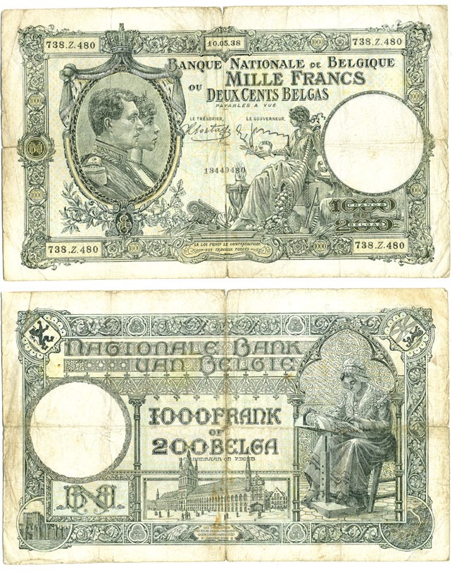БЕЛЬГИЯ 1000 ФРАНКОВ 1938 Pick 104 бумага 6289-52-1