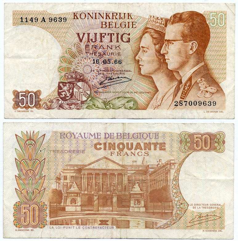 БЕЛЬГИЯ 50 ФРАНКОВ 1966 16 МАЯ 1966, КОРОЛЬ БОДУЭН I И КОРОЛЕВА ФАБИОЛА, ПОДПИСЬ 20 Pick 139 бумага 7222-28-1-2