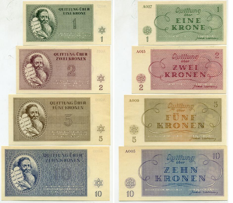 Чехия, Терезинштадт набор из 7 банкнот 1, 2, 5, 10, 20, 50, 100 крон 1943 Терезинское гетто, Еврейское гетто, лагерные деньги бумага UNC (пресс) 451-334-1
