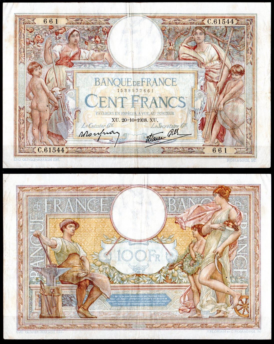 Франция 100 франков 1938 Pick 86 b бумага 7183-6-2-2