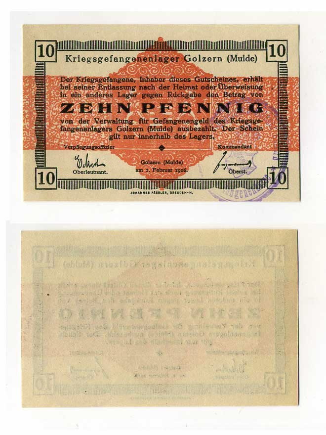 Германия 10 пфеннигов 1916 Голцерн (Мюльде), лагерь военнопленных C-3013 бумага UNC (пресс) 504-78-3-1
