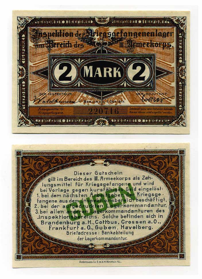 Германия 2 марки 1917 инспекция лагерей военнопленных в Губене, III-ий Армейский корпус C-3059 бумага UNC (пресс) 504-75-1-1