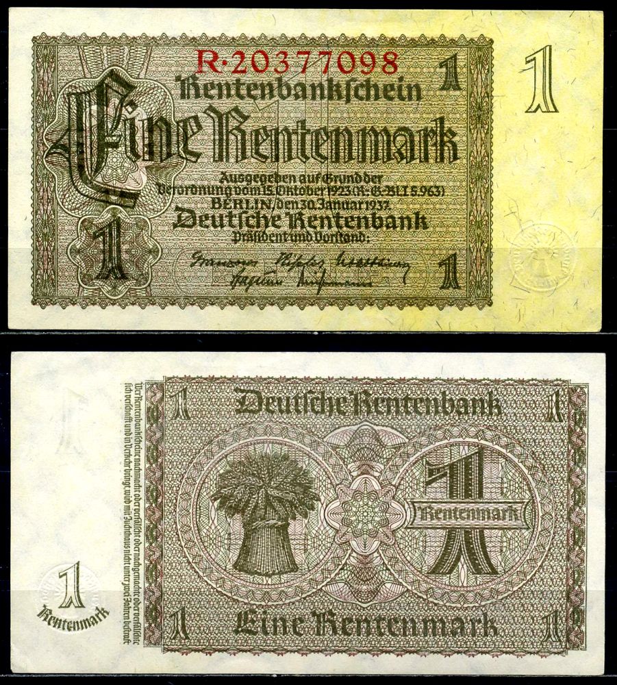 Германия 1 рентенмарка 1937 30 января 1937, серия R, номер 8-значный Pick 173, Розенберг 166b бумага аUNC 3295-25-3-2