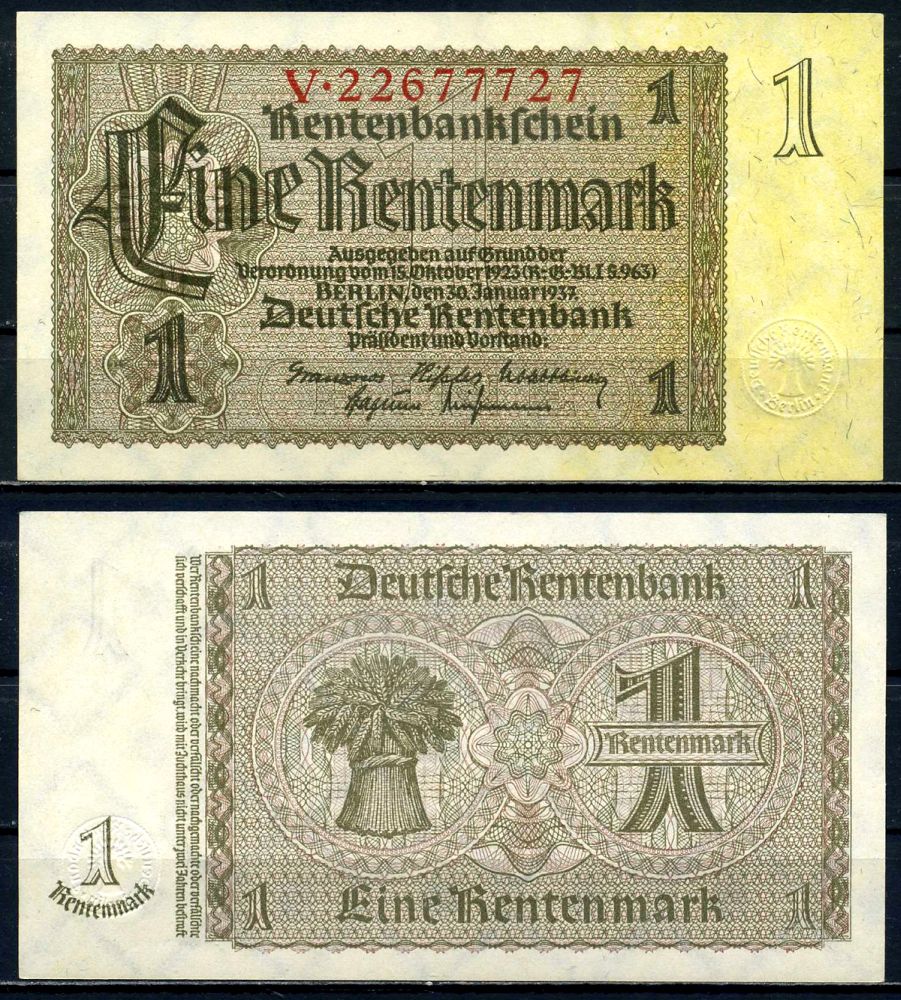 Германия 1 рентенмарка 1937 30 января 1937, серия V, номер 8-значный Pick 173, Розенберг 166b бумага аUNC 3295-27-3-2