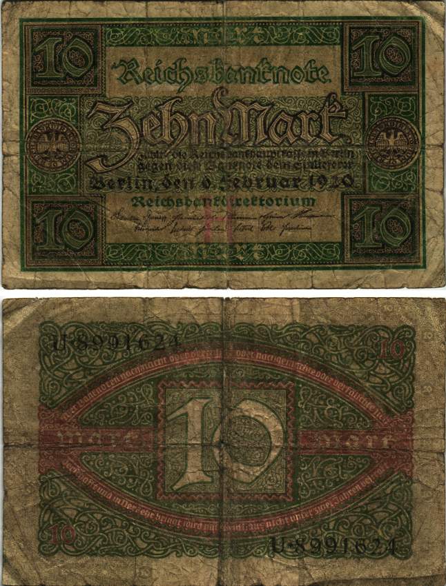 ГЕРМАНИЯ 10 МАРОК 1920 6 ФЕВРАЛЯ 1920, БУКВА H, СЕРИЯ U, СЕМЬ ЦИФР В НОМЕРЕ Pick 67а, Rosenberg 63а бумага 8616-14-1-2