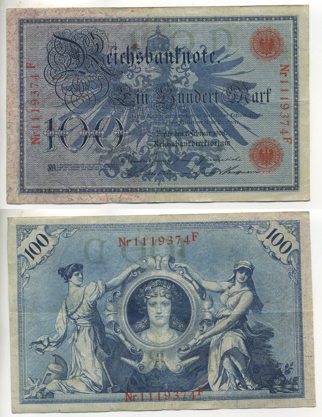 ГЕРМАНИЯ 100 МАРОК 1908 7 ФЕВРАЛЯ 1908, КРАСНАЯ ПЕЧАТЬ, ДЛИННА НОМЕРА СЕРИИ 29 ММ. Pick 33а бумага 7487-69-1