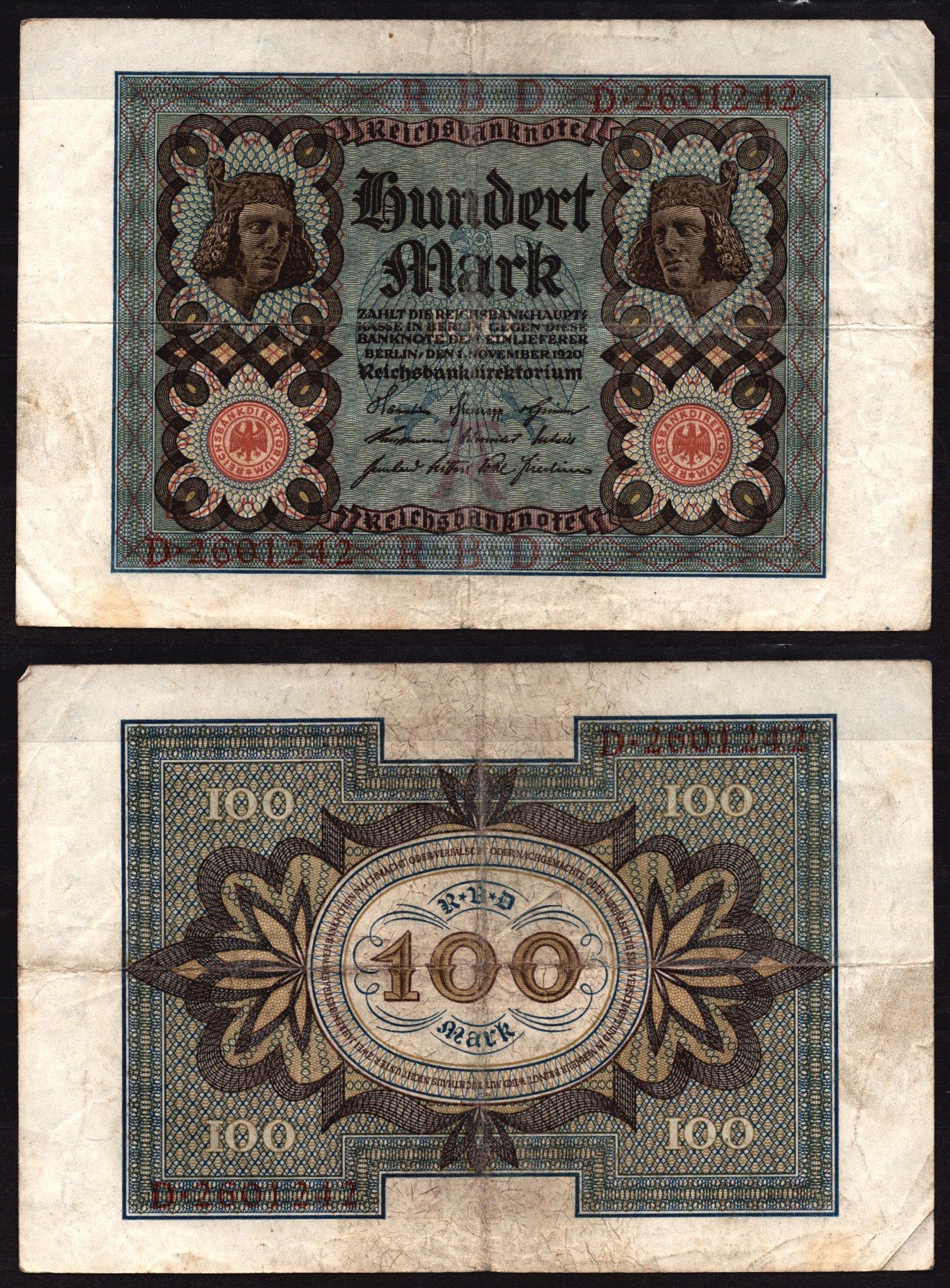 Германия 100 марок 1921 Веймар,7 цифр в номере, A, «Бамбергский всадник» из оперы «Купол Бамберга». Pick 69 a бумага 6289-14-2-2