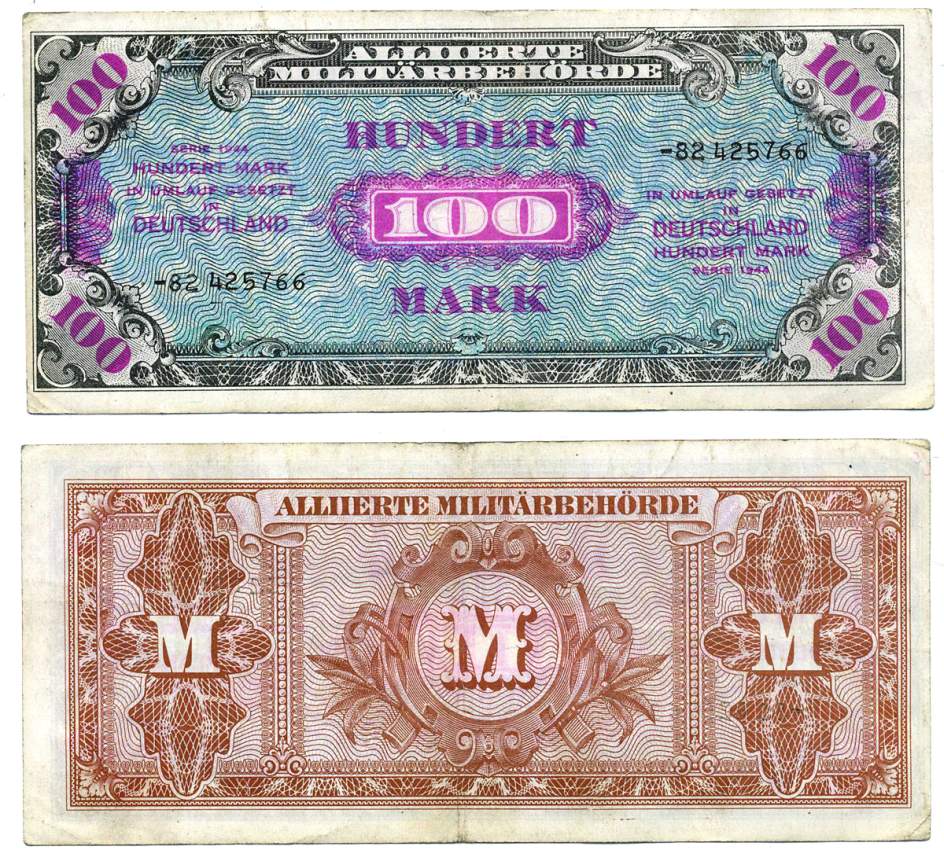 Германия, оккупация союзниками 100 марок 1944 8 цифр, без кода, выпуск СССР Pick 197 d, Розенберг 206 d бумага 8612-29-2-2