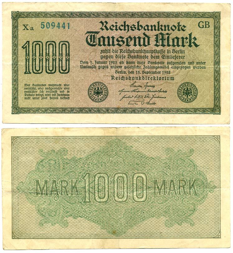 ГЕРМАНИЯ 1000 МАРОК 1922 15 СЕНТЯБРЯ 1922, ВОДЯНОЙ ЗНАК G, БЕЛАЯ БУМАГА Pick 76e бумага 7548-10-2-1