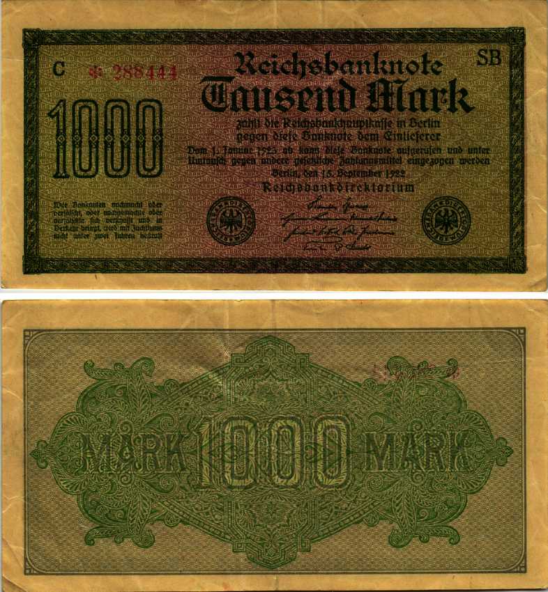 ГЕРМАНИЯ 1000 МАРОК 1922 15 СЕНТЯБРЯ 1922, ВОДЯНОЙ ЗНАК I, ЖЕЛТАЯ БУМАГА, СЕРИЯ SВ Pick 76b, Rosenberg 75d бумага 7547-28-1