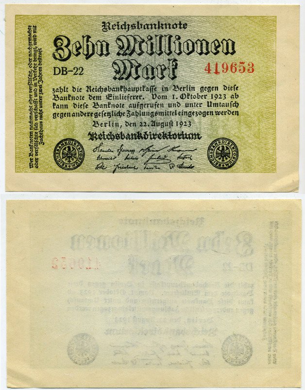 Германия 10000000 марок 1923 22.08.1923, водяной знак звезда в крючках Pick 106a бумага aUNC 445-14-1-2