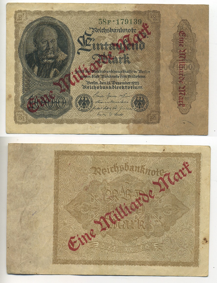Германия 1000000000 марок 1923 сентябрь 1923, диагональная красная надпечатка на 1000 марок 1922 Pick 113a бумага 00-00