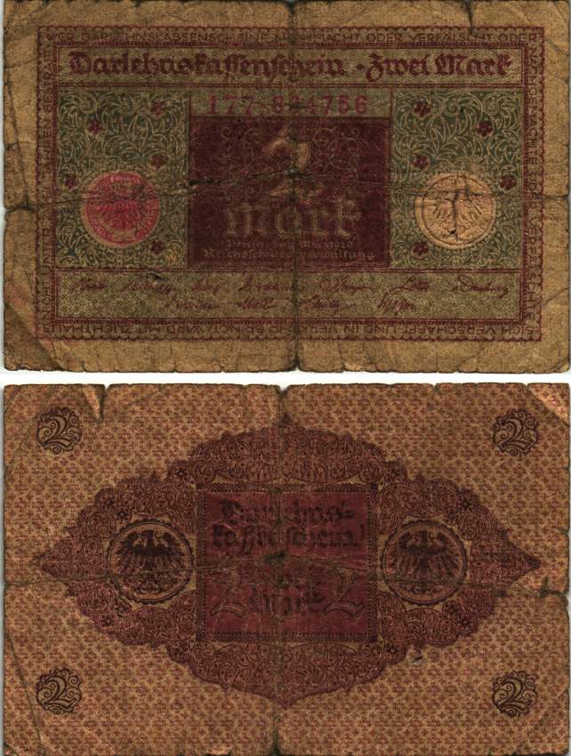 ГЕРМАНИЯ 2 МАРКИ 1920 1 МАРТА 1920, ВЕЙМАРСКАЯ РЕСПУБЛИКА, КОРИЧНЕВАЯ, СЕРИЯ 177 Pick 60, Rosenberg 65a бумага 7547-98-2