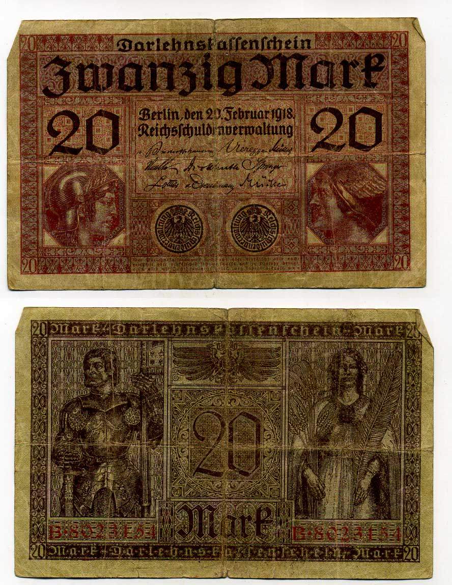 ГЕРМАНИЯ 20 МАРОК 1918 20 ФЕВРАЛЯ 1918, СЕРИЯ B, КРАСНАЯ, МИНЕРВА И МЕРКУРИЙ Pick 57, Rosenberg 55 бумага 6283-48-3