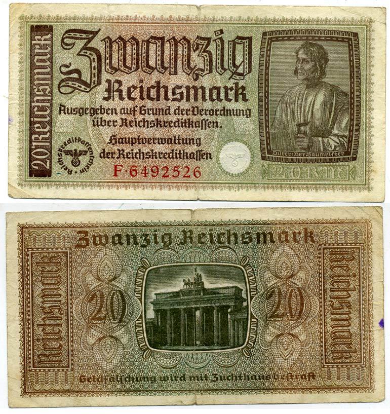 ГЕРМАНИЯ 20 РЕЙХСМАРОК 1940-1945 ДЛЯ ОККУПИРОВАННЫХ ТЕРРИТОРИЙ Pick R139 бумага 3295-65-3