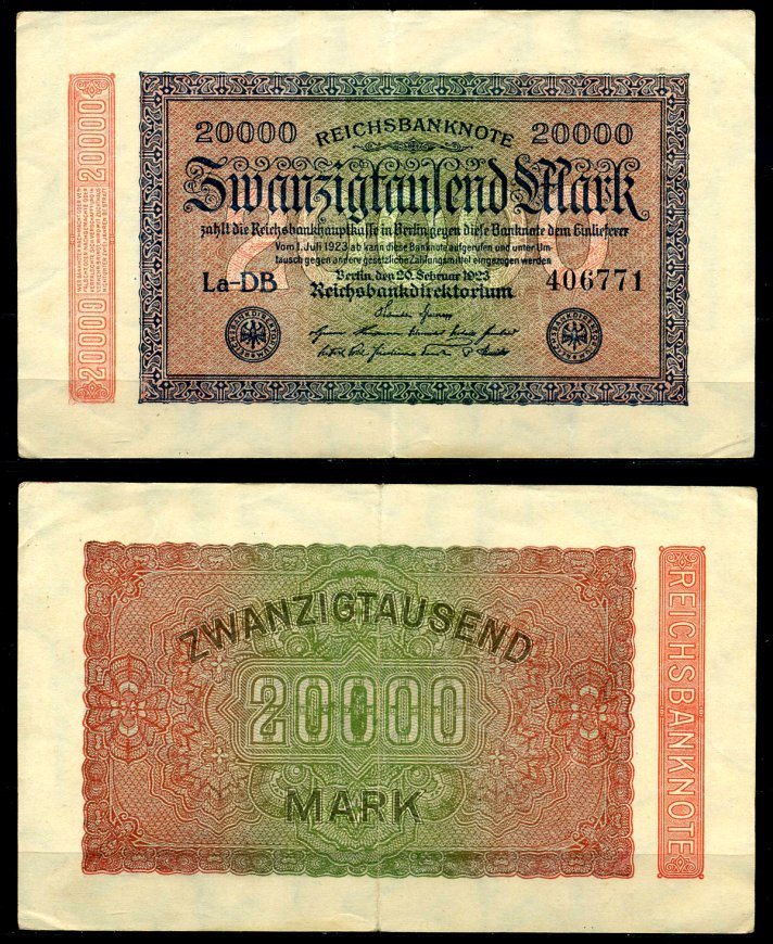 Германия 20000 марок 1923 20 февраля 1923, в/з №47, номер шестизначный Pick 85, Розенберг 84е бумага 8617-35-1-1
