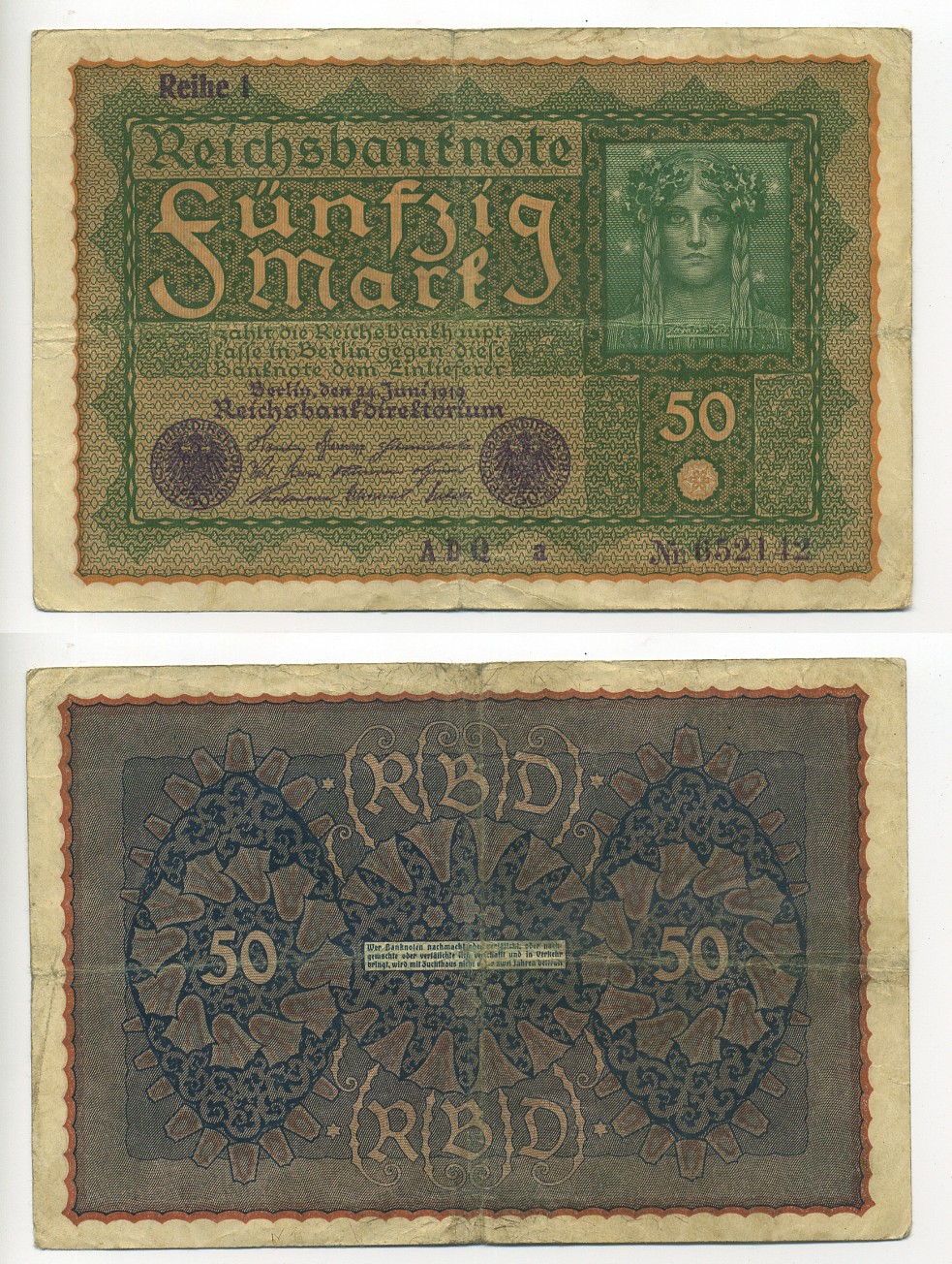ГЕРМАНИЯ 50 МАРОК 1919 24 ИЮНЯ 1919, REIHE I, СЕРИЯ ADQ, ВЫПУСК С НОЯБРЯ 1919 ГОДА Pick 66, Rosenberg 62аа бумага 7217-31-1