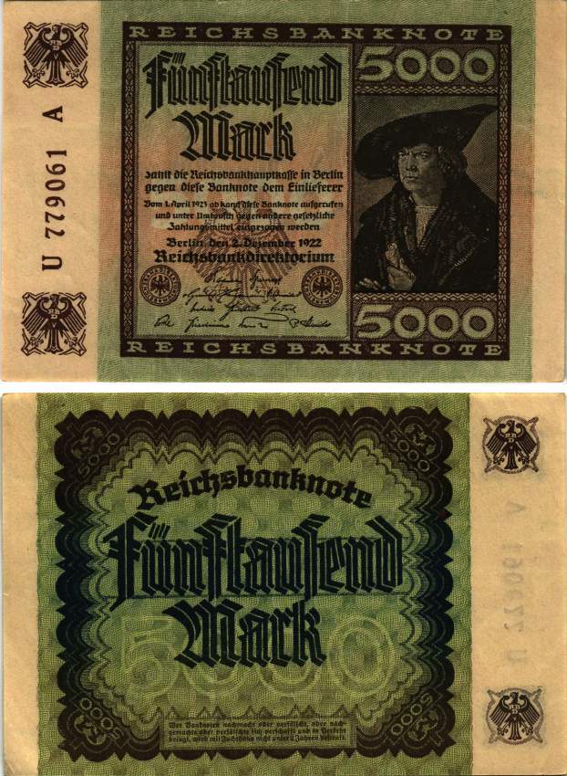 ГЕРМАНИЯ 5000 МАРОК 1922 2 ДЕКАБРЯ 1922, ВОДЯНОЙ ЗНАК Е, G/D В ЗВЁЗДАХ, ШЕСТИЗНАЧНЫЙ НОМЕР, СЕРИЯ U Pick 81а, Розенберг 80a бумага 8615-74-1-1