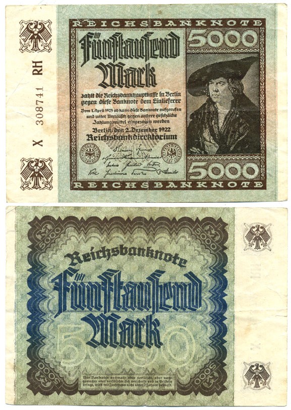 ГЕРМАНИЯ 5000 МАРОК 1922 2 ДЕКАБРЯ 1922, ВОДЯНОЙ ЗНАК Е, В ЗВЁЗДАХ G/D, ДЮРЕР Pick 81а бумага 444-105-1