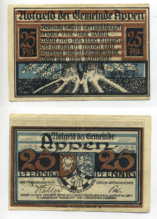 АППЕН 25 ПФЕННИГОВ 1921 НОТГЕЛЬД, ЗЕМЛЯ ШЛЕЗВИГ-ГОЛЬШТЕЙН Grabowski 39.1 бумага 7217-53-4