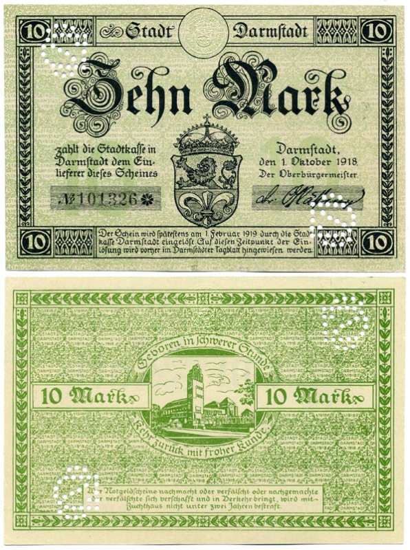ДАРМШТАДТ, ГЕРМАНИЯ 10 МАРОК 1918 - 1919 1 ОКТЯБРЯ 1918 - 1 ФЕВРАЛЯ 1919, НОТГЕЛЬД, ЗЕМЛЯ ГЕССЕН, ВОДЯНОЙ ЗНАК KREUZ-RINGEL-MUSTER, БЕЗ НОМЕРА И СЕРИИ, С ПЕРФОРАЦИЕЙ Geiger 092.04с бумага аUNC 8613-33-1-1