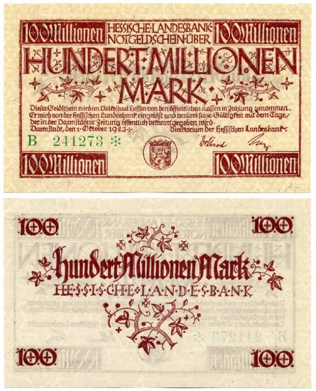 ДАРМШТАДТ, ГЕРМАНИЯ 100000000 МАРОК (100 МИЛЛИОНОВ МАРОК) 1923 1 СЕНТЯБРЯ 1923, НОТГЕЛЬД, ЗЕМЛЯ ГЕССЕН, НОМЕР, СНЕЖИНКА, СЕРИЯ С, ЗЕЛЁНАЯ, HESSESCHE LANDESBANK Keller 956е бумага UNC (ПРЕСС) 8613-25-3-2