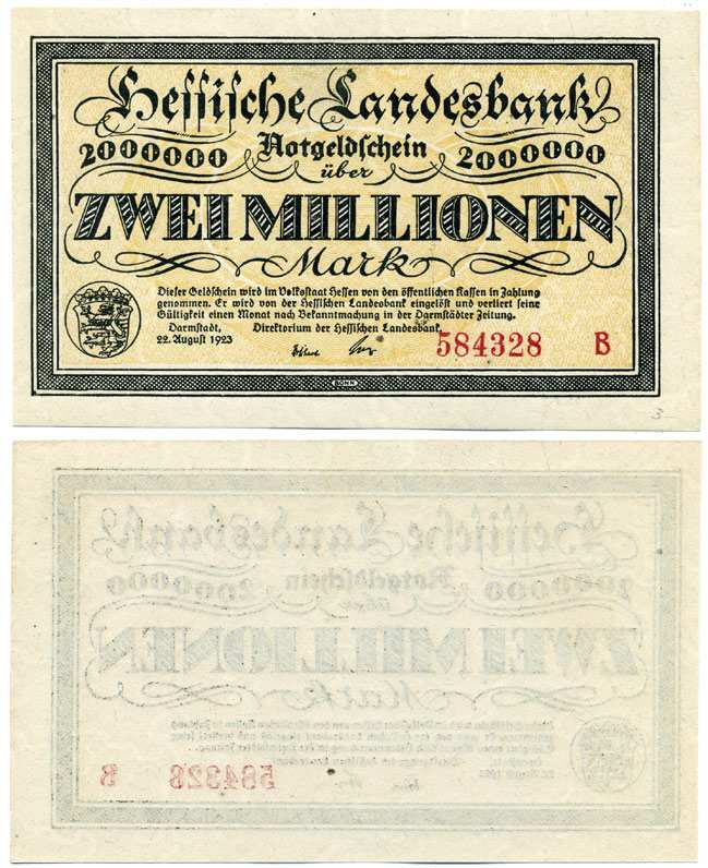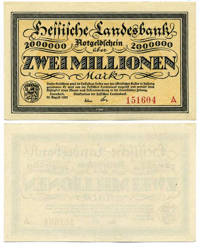 ДАРМШТАДТ, ГЕРМАНИЯ 2000000 МАРОК (ДВА МИЛЛИОНА МАРОК) 1923 22 АВГУСТА 1923, НОТГЕЛЬД, ЗЕМЛЯ ГЕССЕН, СЕРИЯ А, HESSESCHE LANDESBANK Keller 956а бумага аUNC 8613-27-1-2