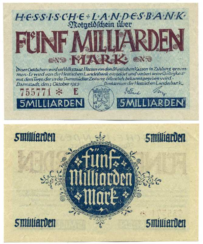 Германия, Дармштадт 5000000000 марок (5 миллиардов марок) 1923 1 октября 1923, нотгельд, земля Гессен, номер, снежинка, серия В, Hessesche Landesbank Keller 956е бумага UNC (пресс) 8613-22-3-2