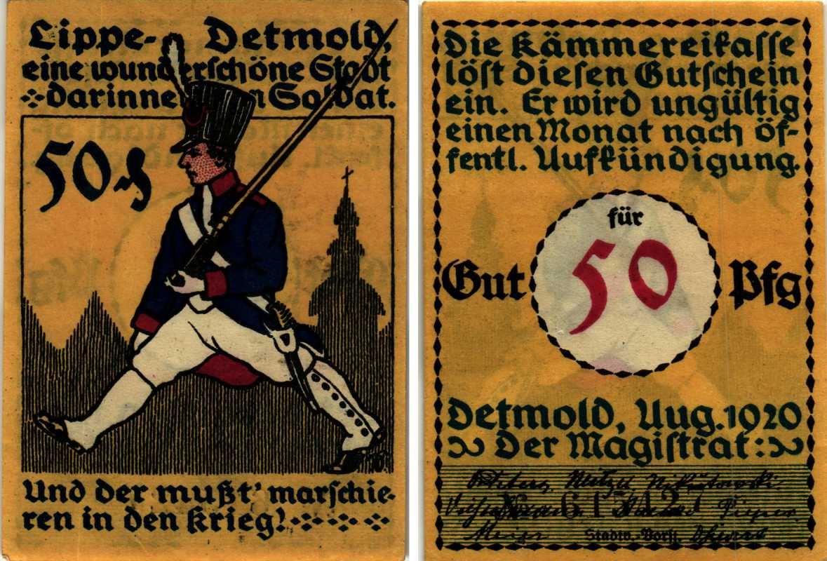 ДЕТМОЛЬД, ЛИППЕ, ГЕРМАНИЯ 50 ПФЕННИГОВ 1920 НОТГЕЛЬД, АВГУСТ 1920, ЗЕМЛЯ СЕВЕРНЫЙ РЕЙН-ВЕСТФАЛИЯ, НОМЕР КОРИЧНЕВЫЙ ARNOLD KELLER 268.1g бумага 7523-54-2-2