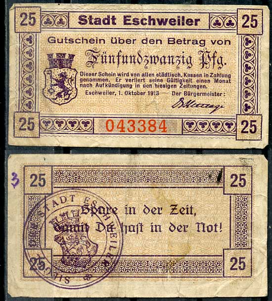 Германия, Эшвайлер 25 пфеннигов 1918 нотгельд, 1.10.1918 бумага 8614-44-2-2
