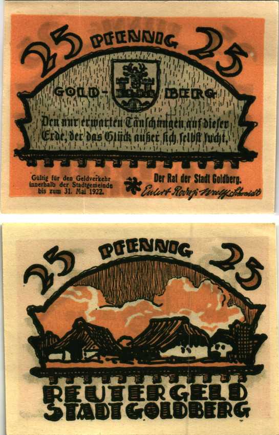 ГОЛЬДБЕРГ 25 ПФЕННИГОВ 1922 НОТГЕЛЬД, ИЮНЬ 1922 - 31 МАЯ 1922, ЗЕМЛЯ МЕКЛЕНБУРГ ПЕРЕДНЯЯ ПОМЕРАНИЯ Grabowski 452.1 бумага 7547-97-1-1