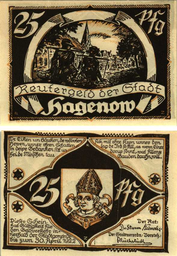 ХАГЕНОВ 25 ПФЕННИГОВ 1922 НОТГЕЛЬД, 1922 - 30 АПРЕЛЯ 1922, ЗЕМЛЯ МЕКЛЕНБУРГ-ПЕРЕДНЯЯ ПОМЕРАНИЯ Grabowski 500.2 бумага 7547-88-4-1