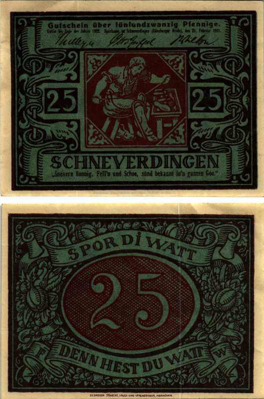 ШНЕФЕРДИНГЕН 25 ПФЕННИГОВ 1921 25 ФЕВРАЛЯ 1921 - 1922, НОТГЕЛЬД, ЗЕМЛЯ НИЖНЯЯ САКСОНИЯ Keller 1193.1 бумага 6318-15-2-2