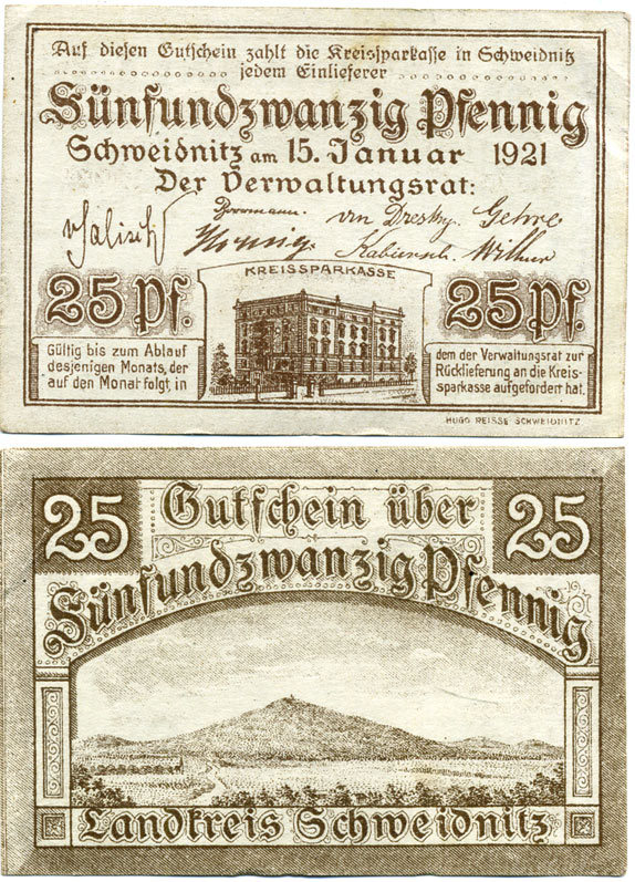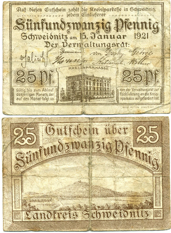 ШВЕЙДНИЦ (СВИДНИЦА ПОЛЬША) 25 ПФЕННИГОВ 1920 НОТГЕЛЬД, 15 ЯНВАРЯ 1921 Grabowski S61.3b бумага 7551-39-1-2