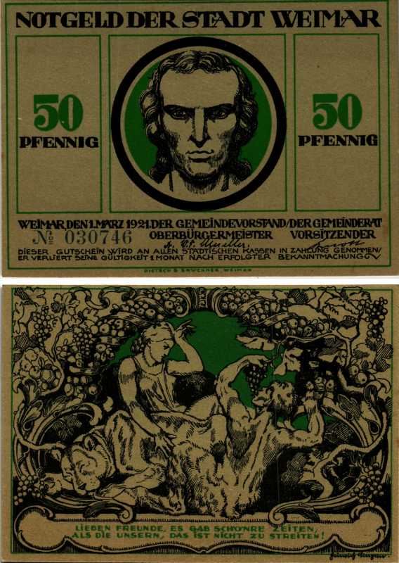 ВЕЙМАР, ГЕРМАНИЯ 50 ПФЕННИГОВ 1921 НОТГЕЛЬД, ЗЕМЛЯ ТЮРИНГИЯ, 1 МАРТА 1921, ЗЕЛЁНАЯ ARNOLD KELLER 1398.6 бумага UNC (ПРЕСС) 7551-32-4-2