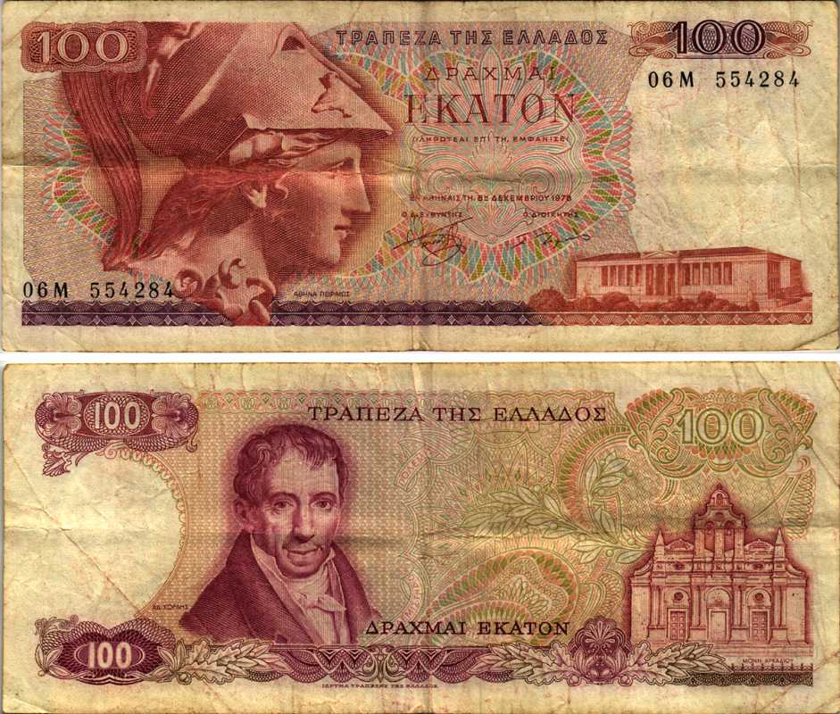 ГРЕЦИЯ 100 ДРАХМ 1978 8 ДЕКАБРЯ 1978, ПЕРВЫЙ ВЫПУСК, АМАНТИОС КАРАИС, АФИНА, МОНАСТЫРЬ АРКАДИ НА ОСТРОВЕ КРИТ Pick 200а бумага 7219-5-1