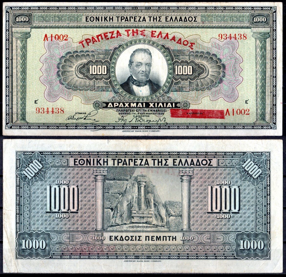 Греция 1000 драхм 1926 Pick 100 b бумага 6281-6-1-2