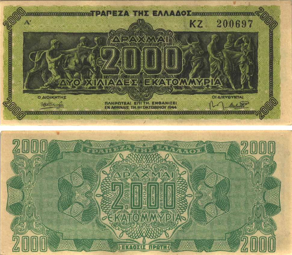 ГРЕЦИЯ 2000000000 ДРАХМ 1944 СЕРИЯ KZ, PREFIX LETTERS, ИНФЛЯЦИОННЫЙ ВЫПУСК Pick 133a бумага UNC (ПРЕСС) 7191-53-3-1