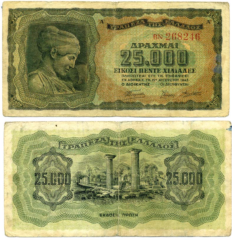 ГРЕЦИЯ 25000 ДРАХМ 1943 12 АВГУСТА 1943, НИМФА ДЕИДАМИЯ, ИНФЛЯЦИОННЫЙ ВЫПУСК, ХРАМ ЗЕВСА В ОЛИМПИИ Pick 123a бумага 7191-51-3-1