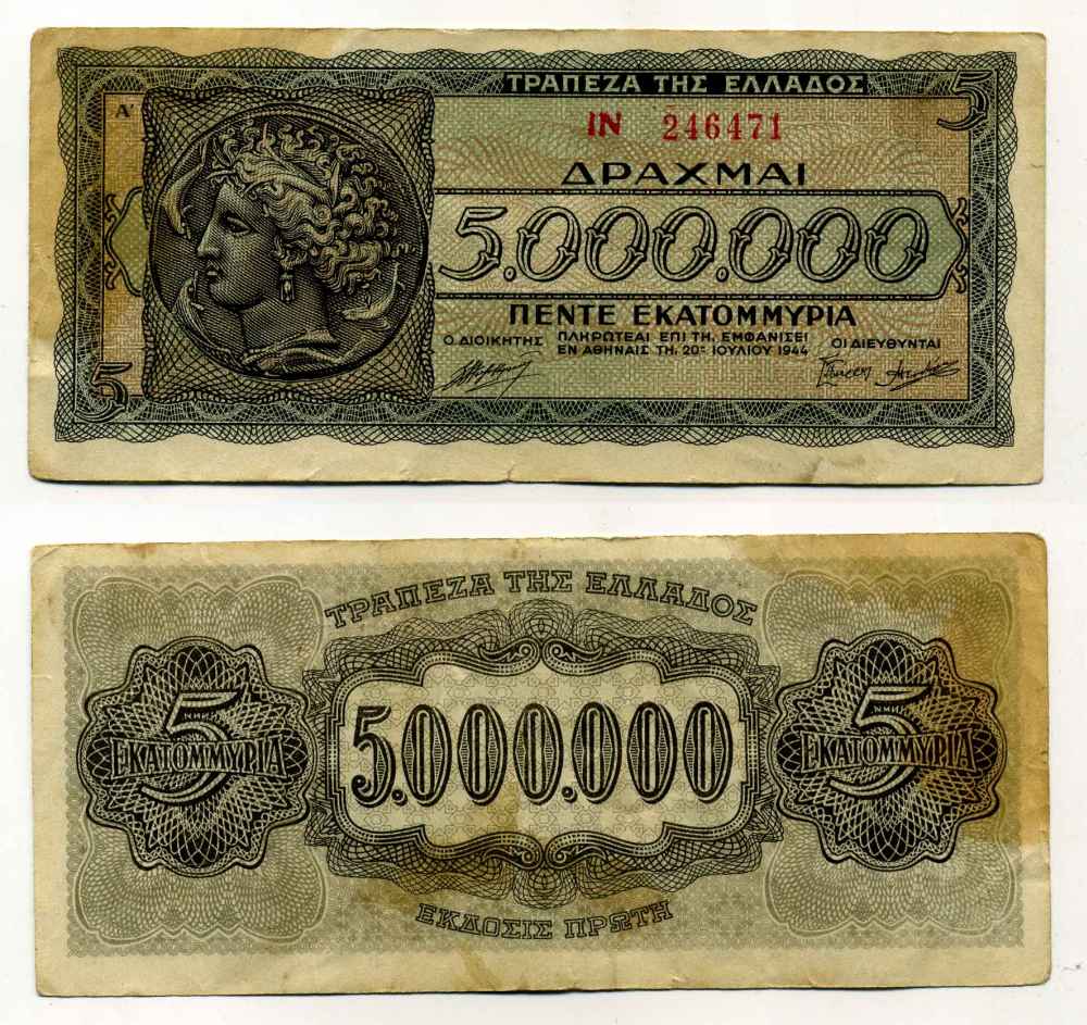 ГРЕЦИЯ 5000000 ДРАХМ 1944 20 ИЮЛЯ 1944, АРЕТУЗА, ИНФЛЯЦИОННЫЙ ВЫПУСК, PREFIX LETTERS Pick 127а бумага 7551-10-2-1