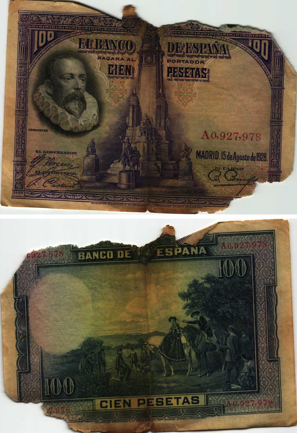 Испания 100 песет 1928 Мигель де Сервантес Сааведра, памятник Сервантесу, картина Дон Кихот Pick 76 а бумага 8609-36-1