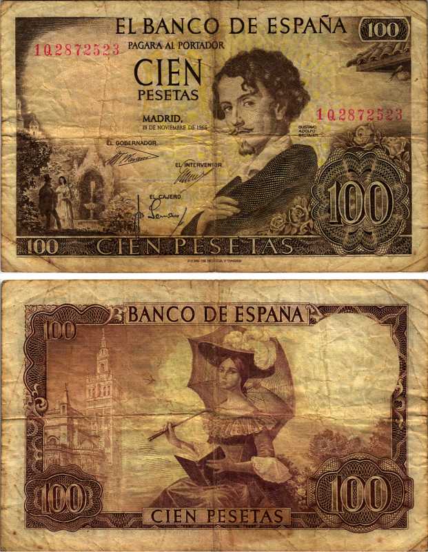 ИСПАНИЯ 100 ПЕСЕТ 1970 19 НОЯБРЯ 1965, ГУСТАВО АДОЛЬФО БЕККЕР ИСПАНСКИЙ ПИСАТЕЛЬ-РОМАНТИК, ЖЕНЩИНА С ЗОНТИКОМ НА ФОНЕ КАФЕДРАЛЬНОГО СОБОРА СЕВИЛЬИ Pick 150 бумага VF-XF 2192-97-2-1