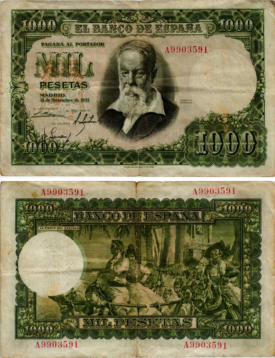 Испания 1000 песет 1951 Хоакин Соролья, испанский живописец Pick 143 а бумага 451-318-2