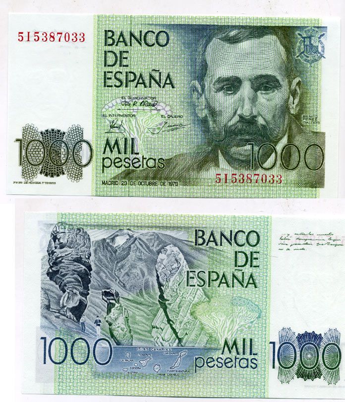 ИСПАНИЯ 1000 ПЕСЕТ 1979 (1982) 23 ОКТЯБРЯ 1979, БЕНИТО ПЕРЕС ГАЛЬДОС, КАРТА КАНАРСКИХ ОСТРОВОВ Pick 158 бумага UNC (ПРЕСС) 444-36-1