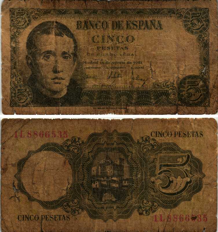 ИСПАНИЯ 5 ПЕСЕТ 1951 16 АВГУСТА 1951, ХАЙМЕ БАЛЬМЕС Pick 140а бумага 7548-123-3-1