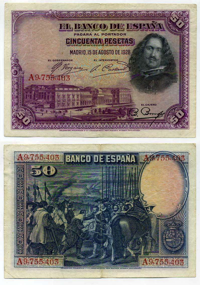 ИСПАНИЯ 50 ПЕСЕТ 1928 А 9755403, МУЗЕЙ ПРАДО В МАДРИДЕ, ДИЕГО ВЕЛАСКЕС Pick 75b бумага 6283-12-3