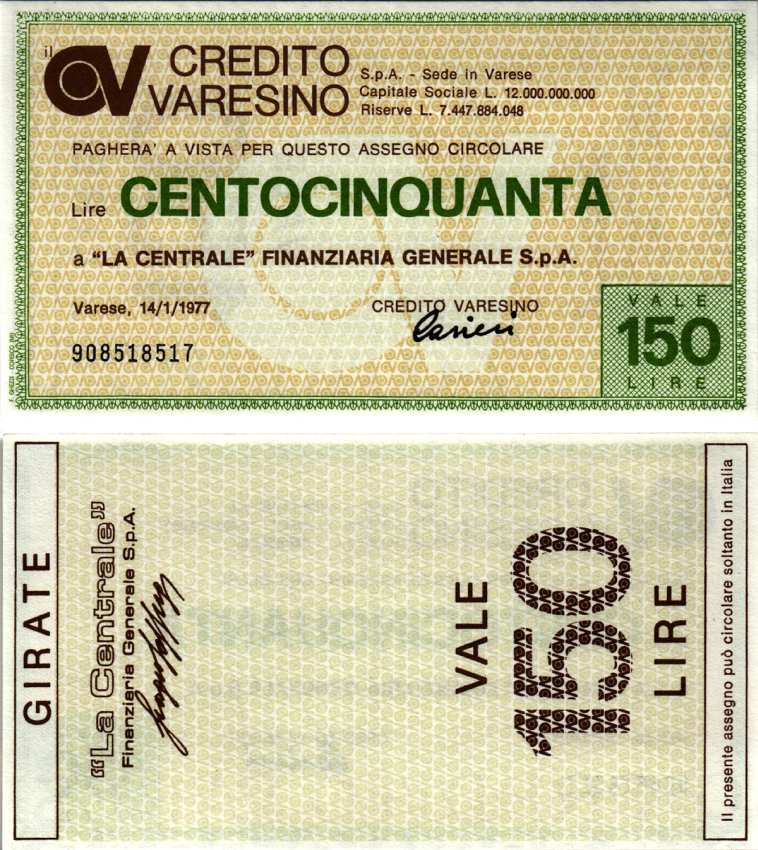 Италия чек на 150 лир 1977 14 января 1977, credito varesino бумага UNC (пресс) 7218-6-3-2